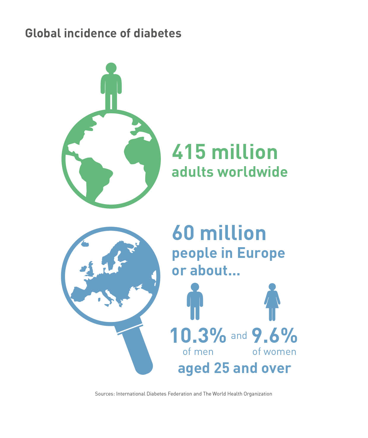 Europe has one of the highest prevalences of diabetes as about 60 million people have type 1 or type 2 diabetes, or about 10.3% of men and 9.6% of women aged 25 years and over¹. It is estimated that this figure will reach 71 million by 20402.